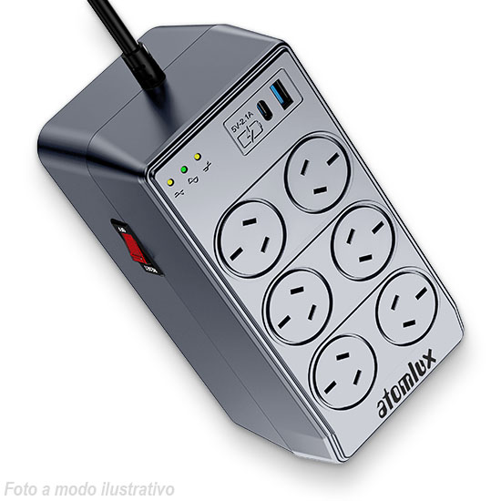 de la red de energía, como baja o sobretensión. Además, cuenta con una salida USB y otra
